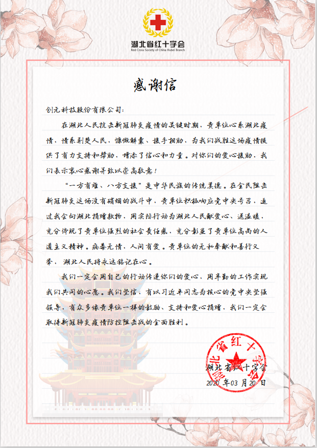 近日,公司收到來自湖北省紅十字會的感謝信,信中湖北省紅十字對公司在疫情期間的捐贈行為表示了衷心的感謝,并表示將會繼續(xù)堅定信念,取得新冠肺炎疫情防控狙擊戰(zhàn)的全面勝利。