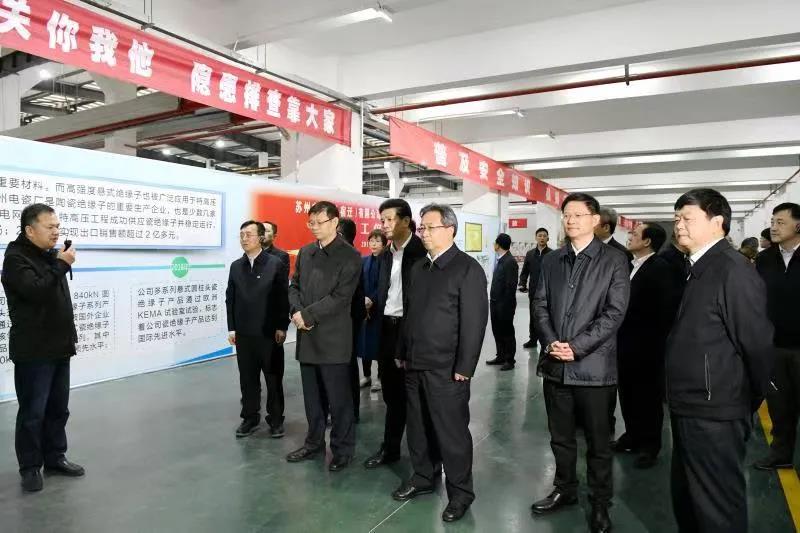 4月1日,江蘇省委常委、蘇州市委書記許昆林,蘇州市委副書記、市長李亞平,宿遷市委書記王昊等赴公司控股子公司蘇州電瓷下屬全資子公司蘇州電瓷廠(宿遷)有限公司(簡稱“宿遷公司”)調研。創元集團黨委書記、董事長沈偉民,副總經理張斌,創元科技副總經理、蘇州電瓷董事長錢國英等陪同調研。