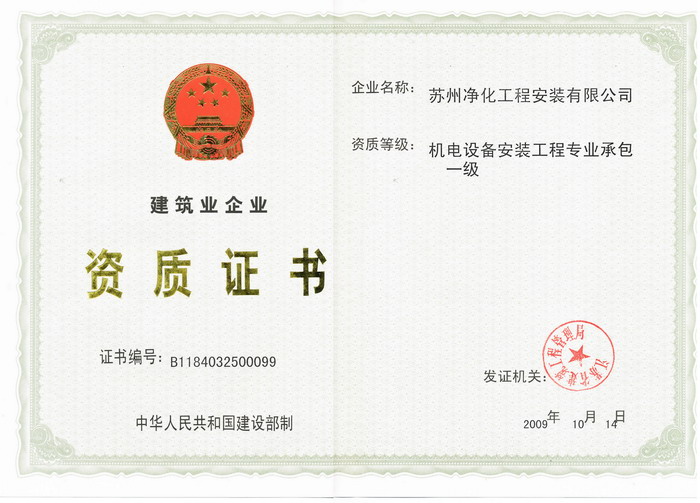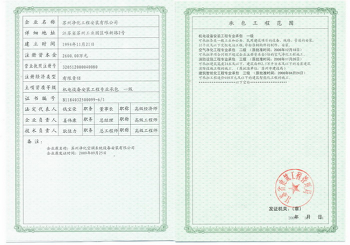 經江蘇省建筑工程管理局批準,蘇凈集團控股子公司——蘇州凈化工程安裝有限公司晉升為機電設備安裝工程專業承包一級資質企業。自此,公司承接的機電設備安裝工程項目將不受項目規模限制,有利于公司進一步開拓市場,提升競爭力。