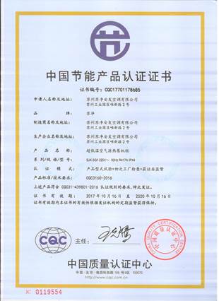 江蘇蘇凈: “超低溫空氣源熱泵機組”榮獲中國節能產品認證